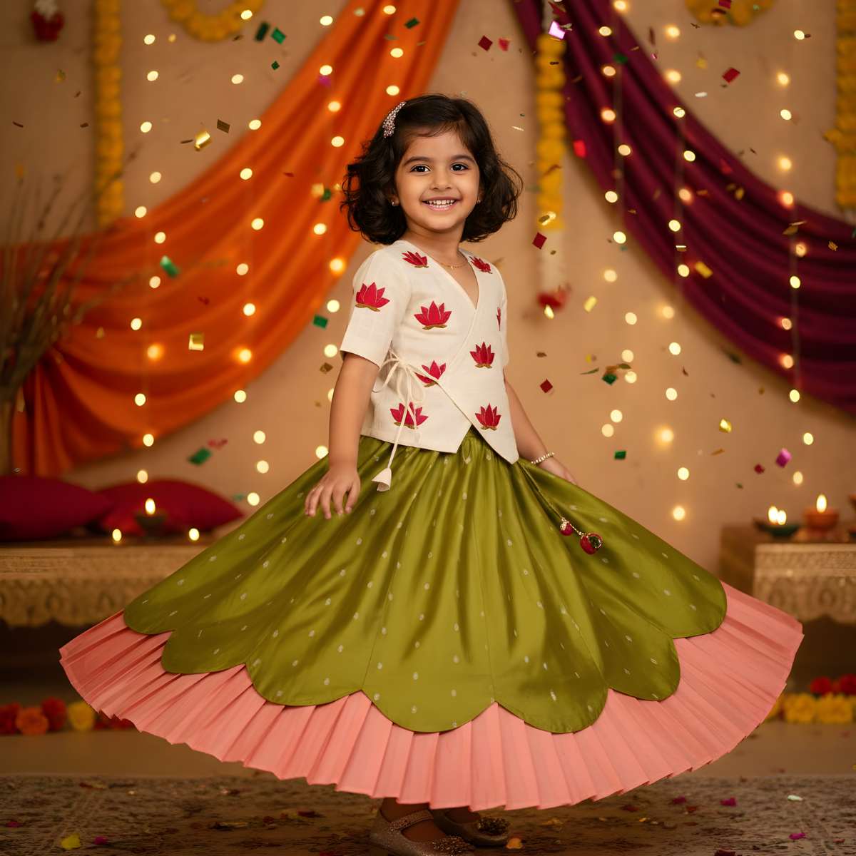 Inspired by the eternal Rasleela this ensemble has an off-white surplice top adorned with dainty lotus butta embroidery, symbolizing purity and divine love. The skirt is double-layered: the top green panel layer features a soft scalloped hem ending at the calf, while the full-length pleated pink layer beneath adds volume, color, and a joyful swish with every step.